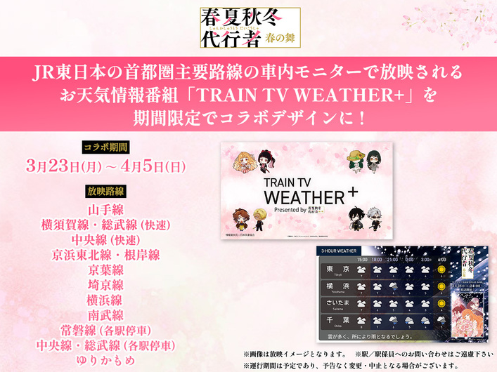 JR東日本の首都圏主要路線の電車内モニターで放映されるお天気情報番組「TRAIN TV WEATHER+」が、期間限定でアニメ「春夏秋冬代行者 春の舞」とのコラボデザインとなることが決定いたしました!